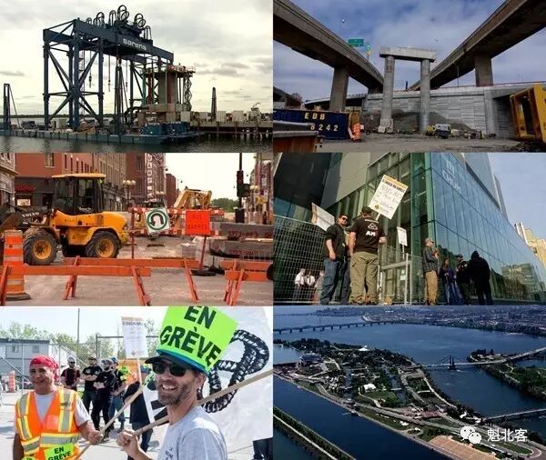前日在蒙特利尔还随处可见、热火朝天的施工工地,随着17.5万建筑工人的集体罢工,一下子安静了下来。蒙村儿基础设施建设部负责人表示,目前停工的项目约有60个,包括造价高达43亿、计划2018年完工的新Champlain大桥;已完成40%、预计2020年秋完工的Turcot立交桥;现已超期、曾预计2016年春、现预计2018年初完工的CHUM医院;7月时即将用于比赛、2项价值1千6百万的F1方程式赛道工程;此外还有各处的街道工程、管道工程、填坑工程……魁省劳工部长曾表示,建筑工人的罢工将让魁北克每天损失4500万元。据悉,曾于2013年发生的建筑行业10天大罢工导致魁省当年的GDP下降了1.1%。