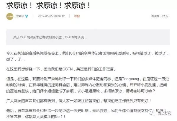 柯洁与 AlphaGo 于25日进行第二局大战,再次落败。赛后的新闻发布会上,一名来自中国国际电视台的记者用英文提问柯洁,柯洁怼记者:“中国人就用中文提问。”记者强词夺理,说英语就是他们的工作,遭到网友严重质疑……晚8点,该电视台官方微博开始道歉:求原谅!求原谅!求原谅……事后,聂卫平对此事发表看法:这位记者用英语提问不是工作需要,而是装酷需要。按照传统中国人“尽量不麻烦别人”的准则来看,这位记者显然有失考虑。柯洁年轻,血气方刚,直言不讳,挑明中国人中国场合要说中国话,这必须点赞。据悉,中国国际电视台 CGTN 是一家央视新筹备的国际传播机构。