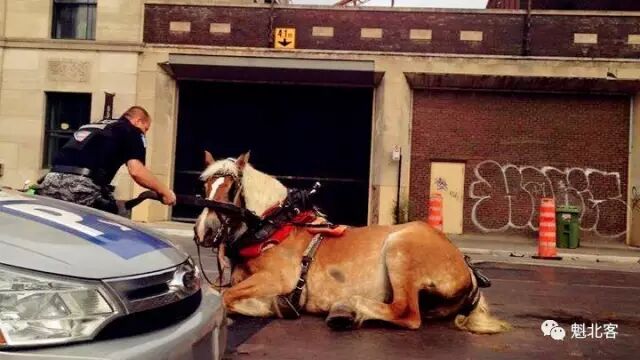 相关的事件还有很多,几乎都是由网友爆出,比如这张曾被发布在社交媒体上的照片,照片中显示一匹马累倒在蒙特利尔的老城街头,站立不起,警方正在帮忙处理。