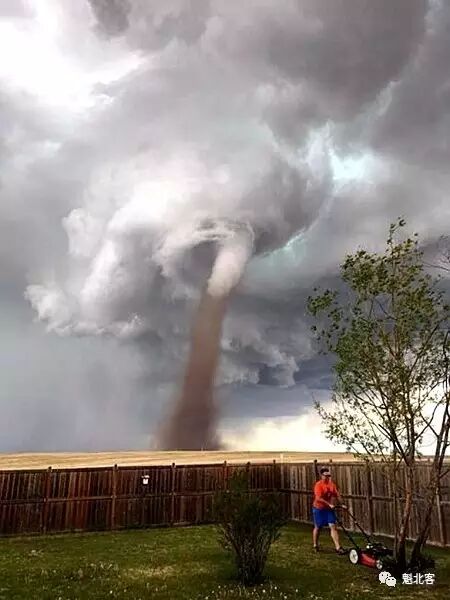 据加通社,上周五,阿尔伯塔省的Cecilia Wessels给丈夫拍了一张他正在割草的照片,而当时正有一股龙卷风从他家路过。于是,神奇的场景出现了,丈夫Theunis在院内割草,而院外就是正在盘旋怒吼的龙卷风。夫妻俩说,那股龙卷风实际上比照片上看起来要远,而且正在朝离开他们家的方向移动。Cecilia Wessels说,她拍下这张照片是为了给她在南非的父母看,而她的父母当时就吓傻了:为什么你的丈夫专挑这个时候在外面割草?