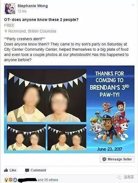 家住列治文的华人妈妈Stephanie Wong近日在网上发帖,称其私人派对上有陌生人闯入并白吃白喝。据悉,上周六,Wong与丈夫为其3岁儿子在社区中心举办生日派对,他们注意到有两名陌生华人女士在派对的照片亭中拍照。她上前询问她们是谁,她们则指向远处一位戴眼镜的女士说:“我们和她一起来的”。但当Wong前去询问这位戴眼镜的朋友时,对方却表示根本不认识她们。Wong赶紧回去找她们,发现这两名陌生女子已拍完了照片,开溜前还端走了一大盘食物……Wong在网上发帖后,居然真的有网友认出了她们,指称这两名陌生女子已是惯犯,曾去过其他派对,二话不说就劈头盖脸直接管主人要蛋糕吃,好像从没失过手……