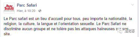 声明大意是:Safari公园欢迎所有人,无关国籍、宗教、文化、语言和性别。我们不歧视任何团体,不容忍在我们的地盘上搞任何仇恨和攻击。