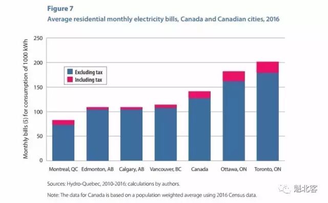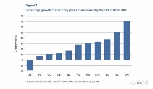 如果以2008为一个起点计算电价,那么2008-2016期间,魁省的电价仅仅增长了11%左右,而安省同期竟然增长了71%。
