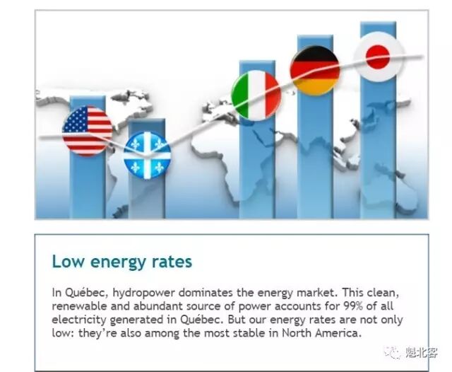 从政府统计数据看,魁省的电价之低不仅享誉北美,即使放眼全球也处于有利的价格优势中。据悉,魁省电力主要由Hydro-Quebec提供,90%以上使用水电站能源,温室气体排放量低于北美同业标准49倍。