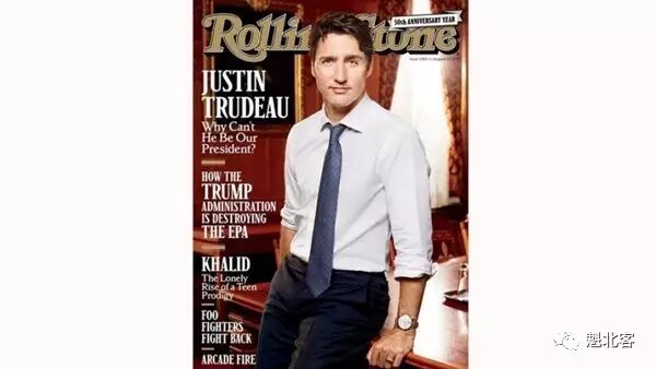 加拿大总理贾斯汀·特鲁多登上了美国权威音乐杂志《滚石杂志》8月份的封面,标题非常挑衅:为什么他不能成为我们的总统?这张照片由著名摄影师Martin Schoeller拍摄于渥太华国会大厦内,特鲁多身穿白衬衫,靠坐在桌边。特鲁多是继美国前总统克林顿和奥巴马之后登上该杂志的又一位国家领导人。美国作者Stephen Rodrick在文中介绍了特鲁多的显赫家世,对比了特鲁多和特朗普的施政纲领,概述了两人在卫生保健、大麻合法化和环境政策上的鲜明分歧。Rodrick在文中写道:特鲁多正试图用与我们不同的方法,让加拿大再次走向强大。