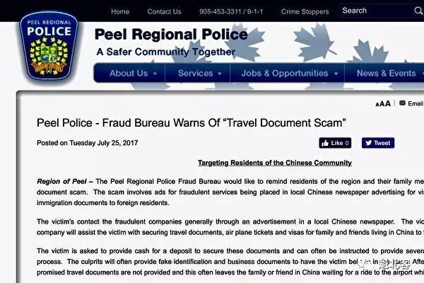 安省皮尔区警方25日表示,有不法份子在当地中文报纸上刊登广告,声称可协助受害人办理旅行证件、机票和签证,令其在中国的家人与朋友赴加拿大工作。罪犯提供虚假身份和商业文件,让受害人信以为真,并要求受害人多次支付现金作为押金,但在收钱之后便会音讯全无。警方称,涉案公司为“高盛投资公司 Gao Sheng Investment Corporation”,实际上并不存在。警方提醒居民,骗局往往具备以下特点: