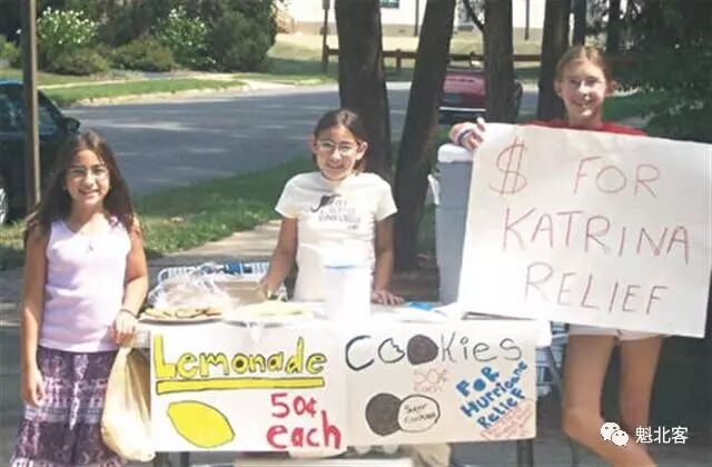 Nicole 和 Alex Marinello 以及 Sara Link 摆出卖柠檬水的摊子,他们要将收入捐给那些遭受卡特里娜飓风的灾民。