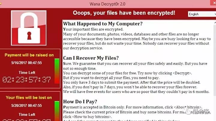 该病毒利用Windows系统中的一个漏洞,对用户计算机内的文档、图片等实施高强度加密,并向用户勒索价值300美元的比特币赎金。这种加密方式非常复杂,每台计算机有被加以不同的加密序列号,以目前的技术手段几乎无法破解。