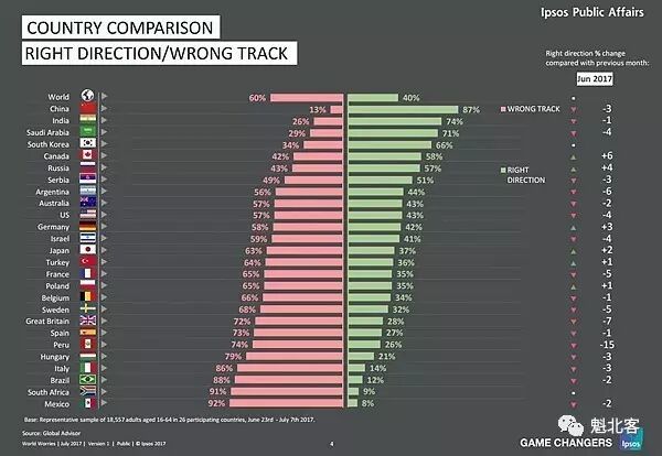 益普索在26个国家发起调查:“你认可自己国家的发展方向吗?”。中国有87%的受访者认同国家走向,位居认同率榜首。印度74%排第二、后面是沙特71%、韩国66%、加拿大58%、俄罗斯57%及塞尔维亚51%。认同率未超半数的美国43%排名第十,德国42%,以色列41%,日本37%,法国35%、瑞典32%、英国28%,这些国家的人民多因担心“失业”、“政治腐败”、“贫穷及社会不公”而怀疑自己国家现有的走向。墨西哥受访者最不乐观,仅8%的受访者认同墨西哥方向正确。西班牙、韩国和意大利人民最担心“失业”;匈牙利人民最关心医保;墨西哥则最害怕犯罪及暴力。虽然中国有87%的受访者对国家保持高度信心,但同时也有47%的人担心“道德低落”,中国是此次被调访国家中唯一忧虑“道德”的国家。