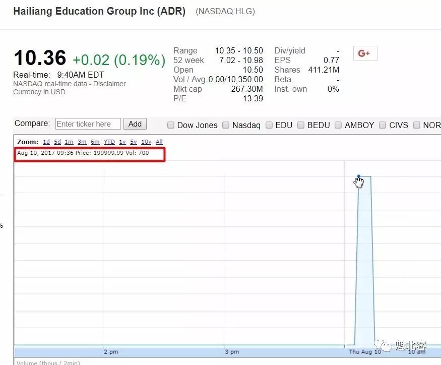 9:35分,就是这支代号为HLG的股票,突然间股价暴涨到每股$ 199,999.99 (亲,小编替您数了,再加一分钱就是每股20万美金)。