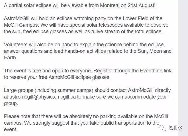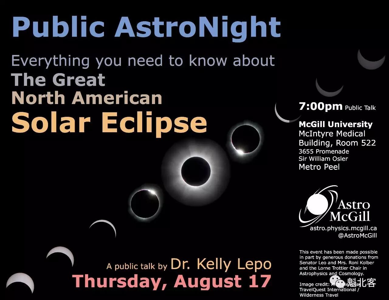 在麦吉尔校园里,AstroMcGill将在8月21日的下午13-16点举办大型免费观测日食的活动。免费入场,提供免费的观测日食眼镜,提供天文望远镜,提供日食相关的手工制作活动和科学知识讲解。