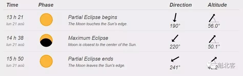 距离核心观测带那么远,但是蒙特利尔还是能看到58.3%的日偏食。具体时间从8月21日的中午13:21开始,14:38达到最高峰,15:50结束。