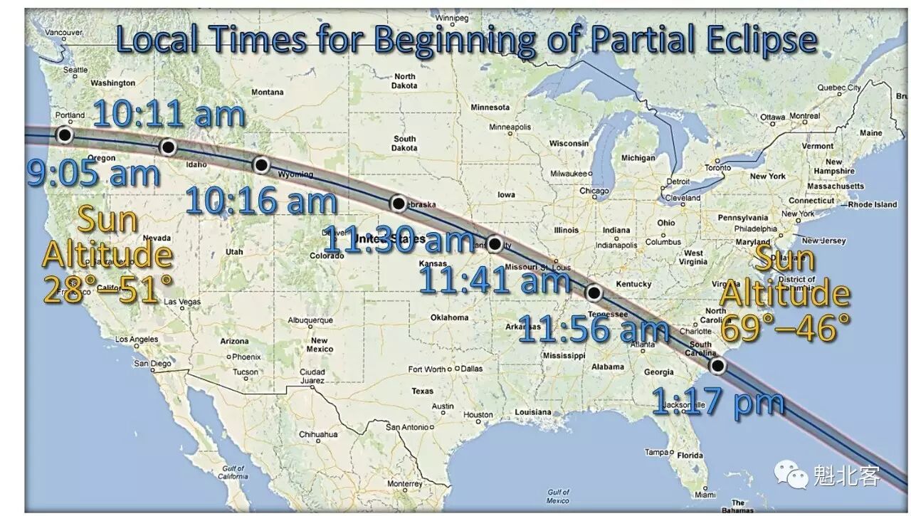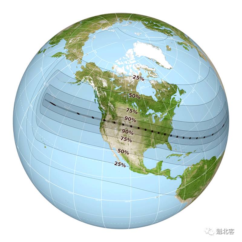 核心地带大约115公里宽,横贯美国12个州,月亮在白天的影子以大约每小时3700公里的速度,从Oregon进入,从SouthCarolina离开。日全食穿越北美大陆的时间大约1小时33分,比飞机快太多了!