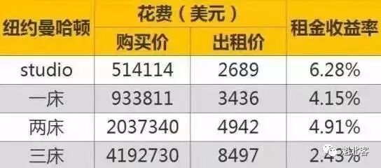 同样在收益看似不高的曼哈顿区,Studio这样的超小户型,投资低而租金回报率非常好,竟然能达到6.28%,而三个卧室的套房收益率竟然只有2.43%。