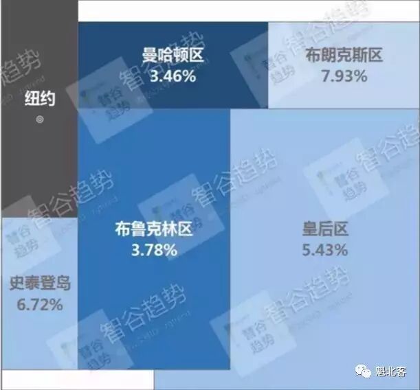 不同地区的差距非常明显。纽约房产热度越高的地区回报率反而较低,这也是因为房价对地段的敏感性更高。