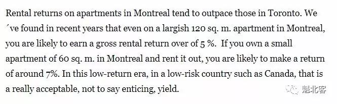 其中提到,“我们发现蒙特利尔近年来120平米的公寓,能获得5%的毛租金回报率。如果你拥有的是大约60平米的公寓,那么获得的回报率在7%左右。对于低风险的国家加拿大,在这样一个低回报率的时代(加拿大的房贷利率只有2%左右),这即使不能说诱人,也可以说真的是可以接受的租金回报率了。”