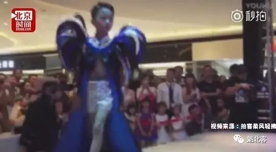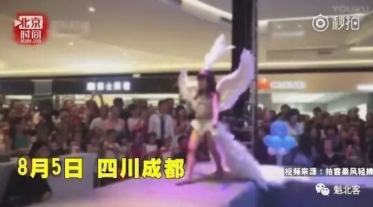 该视频出自8月5日成都某商场,在规模不大的T台上,一群小模特身穿比基尼,背插天使翅膀,腰扎拖尾长裙,走模特步,摆pose。