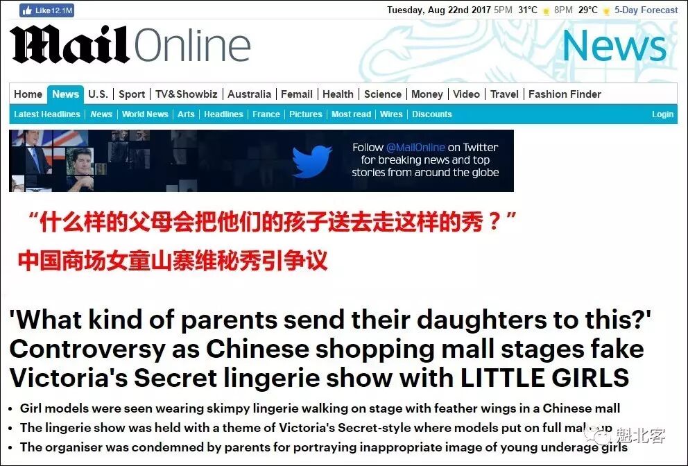 这事儿被外媒知道了。英国《每日邮报》22日刊发文章,标题是《什么样的父母会把自己的女儿送去走这样的秀?中国商场女童山寨维秘秀引发争议》。