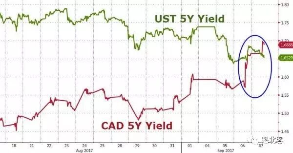 加拿大央行6日意外加息,加拿大国债利率随即跳升。加拿大5年期国债利率2014年来首次高过美国5年期国债利率。来自BMO投资管理公司的高级经济师Sal Guatieri表示,央行加息虽然意外却也在情理之中,加拿大近期经济情况实在有力,央行需要加息以防通胀危险。如果下半年到明年加拿大经济温和增长,那么预计央行可能会放缓收紧力度,加元将从高位回落。这是加拿大央行2010年以来第二次加息,第一次发生在在7月,加央行加息25个基点,成为跟随美联储进入加息轨道的第一家主要央行。本次加拿大央行加息25个基点,利率调整为 1%。