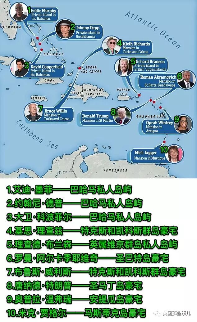 这张示意图一目了然,从最北到最南,在加勒比海各岛拥有物业的各路名流不胜枚举…