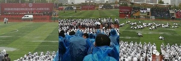 26日,由陕西步长制药有限公司于1997年5月投资创办的民办职业学院,陕西国际商贸学院举行了新学年开学典礼暨该校建校20周年庆祝大会。一名大一新生“兴奋地”说,早上7点半集合,8点入场,然后他们就开始等……从小雨淅沥沥到中雨噼哩噗再到大雨哗啦啦……虽有配发雨衣,可雨实在太大了,不一会儿,同学们就都成了落汤鸡。有的学生被安排席地而坐,全程不许起身的他们更是从上到下透心凉。为了整齐,队伍中的学生不许打伞,打伞的只能是老师或者辅导员。1小时以后,实在没能“等停雨”的领导们冒雨登场,新生在领导们激情的演讲之后接受了检阅——在满是积水的操场上表演了团体操。