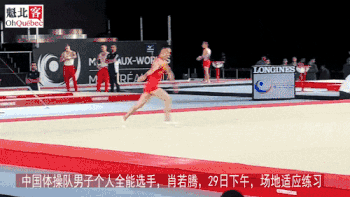 下午5点多,到了中国队适应场地的时间,中国队与东道主加拿大同一小组出现。中国男子全能林超攀、肖若腾首先适应了自由体操的场地。