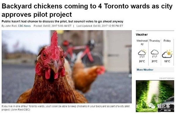 CBC3日报道,在本周的多伦多市议会上,议员们经过3小时激辩,以23票支持对14票反对最终通过:允许市民在后院养鸡。条件限定是:母鸡,公鸡不行,公寓不行。此新规将在四个地区先行试点。投支持票的议员表示:在自家后院养些可生蛋的母鸡,从公共健康角度看,没什么错。它们像猫狗一样干净。投反对票的议员则反复强调:后院养鸡将引来浣熊土狼等食肉动物;鸡能传播沙门氏菌。据悉,双方辩论时激情四溢,“反对派”议员质问:“如果鸡跳出围栏跑出‘被允许养鸡地区’怎么办?“赞成派”议员则回答:“鸡为什么要过马路?”……这辩论……太刺激了……