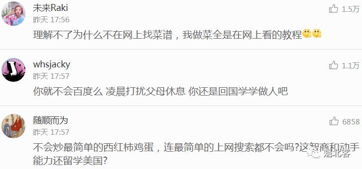 遇到了问题自己想办法解决,自己不能解决求哥们儿帮忙,不到万不得已,他们才不会去找父母求助。像这样凌晨把父母从床上“提搂”起来,就为一个面子,就为一道菜?这极为罕见,这可不是真正的现实。