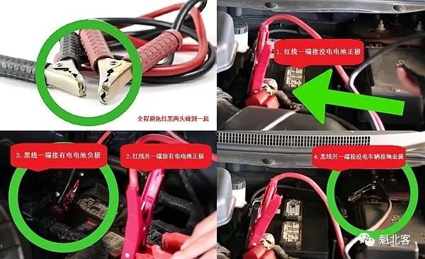 电池搭线:车上最好常备一条“搭火儿”电缆,不仅可以救自己,还能顺便救别人。两车电极连接顺序如下:1.红线一端接没电电池正极;2.红线另端接有电电池正极;3.黑线一端接有电电池负极;4.黑线另端接没电车辆接地金属(尽量别连接没电电池负极,或将引发火花飞溅引爆旧电池释放的氢气);5.反序拆线。全程红黑两头金属禁止相碰。