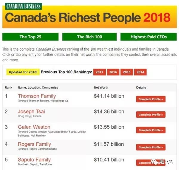 Canadian Business一年一度的“加拿大富人榜”近日出炉。汤姆森家族以411.4亿加元的绝对优势蝉联榜首;现年53岁的阿里巴巴集团副主席蔡崇信蹿升4位成为亚军,净身家143.6亿加元;Loblaw大老板Galen Weston名列第3;玩儿电讯的Rogers家族第4;挤牛奶做奶酪的Saputo家族来自蒙特利尔,以104.1亿加元挤进前5;靠科技发家的Uber老板Garrett Camp85.8亿加元名列第6。现年51岁的小超人李泽楷排名12,身家59.9亿加元,排名比上次上升3位。百富榜第100位,是做办公家具的,Teknion公司老板,81岁的Saul Feldberg,身价10.1亿加元。