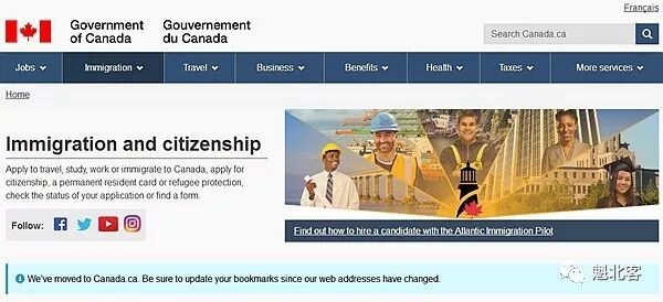 加拿大移民局官方网址已由原来的“www.cic.gc.ca”变更为“https://www.canada.ca”。搜索原网址目前仍然有效,进入页面后将会被自动跳转。加拿大移民局官网提示:我们已搬到Canada.ca,请及时更新您的网页收藏夹。魁北客在此提醒大家:于此地址跳转过渡期间,请随时保持高度警惕,谨防骗子借机作乱。