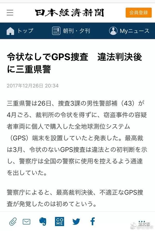 据新浪勿怪幸,说日本三重县警探在搜捕偷车贼,在路上发现嫌疑人偷的车,于是在未取得法庭搜查令的情况下偷偷在该车底部装上GPS定位装置。结果嫌疑人发现后丢弃。之后嫌疑人在外地被捕后爆出GPS的事情。日本最高法院裁判警察违法,因此被调查,面临处分。法治社会,不因为嫌疑人是“坏人”就可以侵犯他的隐私权。