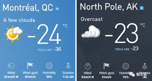 今天,蒙特利尔的最低温度-24,体感-36,而北极也不过只有-23度。环境部本周向全国发布系列极寒及恶劣天气警告。BC省、阿省、曼省和沙省大部地区可能会有低至-40℃的风寒;魁省东南部地区风寒,体感温度最低可至-42℃。此股极寒天气自北极而来,到达魁省就“青出于蓝而胜于蓝”啦。