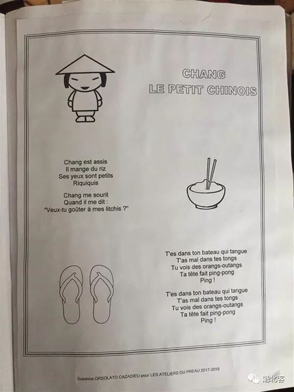 法国巴黎郊区一间幼儿园的儿歌被指带有种族歧视,嘲笑中国人眼睛小,当地反种族主义协会公开谴责,并要求教育部处理。网上曝光的儿歌名为《中国人小张》(Zhang le Petit Chinois),歌意词大意是“张坐着,他吃米饭,他的眼睛很小,很小很小。小张朝我微笑,对我说,来,你要尝尝我的荔枝吗?你坐在晃晃荡荡的船里,穿拖鞋的脚很痛,你看到了大猩猩,你的头里满是乒乓”,配图为一个戴着越南三角帽的亚裔、一碗米饭及一双日式人字拖。当地的SOS反种族主义协会 (SOS – Racisme) 发出公告谴责,儿歌用几个基本的特徵来概括包含中国人在内许多亚洲人的形象,是“充满粗俗的偏见”及“令人作呕”。教育部就表示已交由幼儿园所在学区部门处理。不少网友表示“震惊”、“可怕”、“贬低和讽刺”。法国华人青年协会负责人称,不少华人家长被这首歌“吓坏了”。