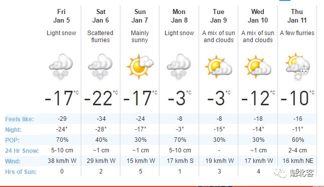 寒流将在周末杀个回马枪,受此影响蒙特利尔地区周五最低体感温度-29,周六最低-34。加拿大环境部门向魁省南部和东部大部分地区发布了降雪、暴风雪和风暴潮警报。预计魁省东部地区将迎来15至20厘米的降雪,而加斯佩地区最高降雪可能高达50厘米;魁北克市有风暴潮警报,风速60公里;蒙特利尔地区有雾霾警报,但是大部分地区受东海岸恶劣天气影响较小。今天蒙特利尔机场取消了前往美加东部海岸地区的几十个航班,有出行计划的乘客出发前确认航班状态。