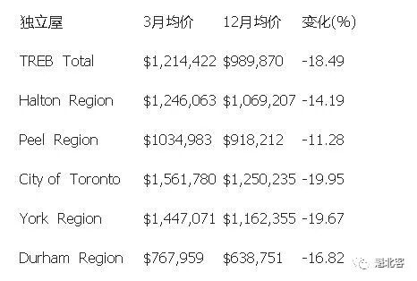 从价格波动最大的独立屋看,去年3月,GTA地区独立屋均价为1,214,422加元,上月则速降至百万以下,为989,870加元,净减224,552,降幅高达18.49%。