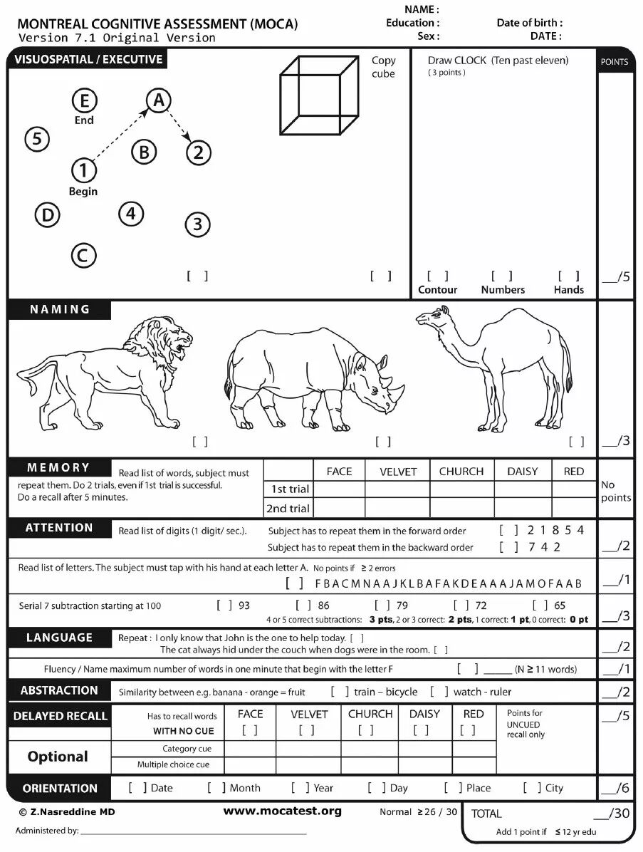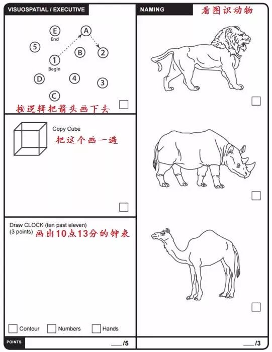 一页测试满分30分,10分钟完成;得分26或以上是正常人,据统计多数正常人平均得分27.4;中度认知障碍平均分在22.1;老年痴呆是在16.2分一下。