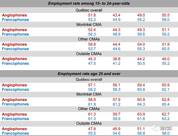 除老龄化影响外,英语人口的失业率也比法语人口高。