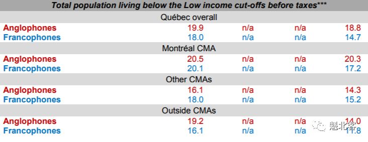 若论魁省人口贫穷比例,讲英语的穷人(anglophones)可比讲法语的穷人(francophones)多好多哈……