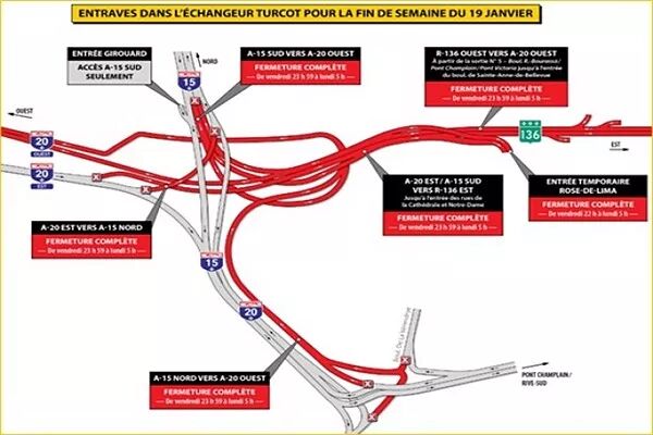 重要通知:自今晚23点30分起的整个周末,Turcot立交桥有重大施工,多条道路及匝道关闭,除南北双向、西往南未被封路之外,南往东西,北往东西,西往北匝道全部被封,东西双向各有出口被封。周末出行前,请先行查看谷歌地图,能避开Turcot立交桥及周边地区最好,实在避不开,那就提早出门,按其道路变更指示耐心堵行。