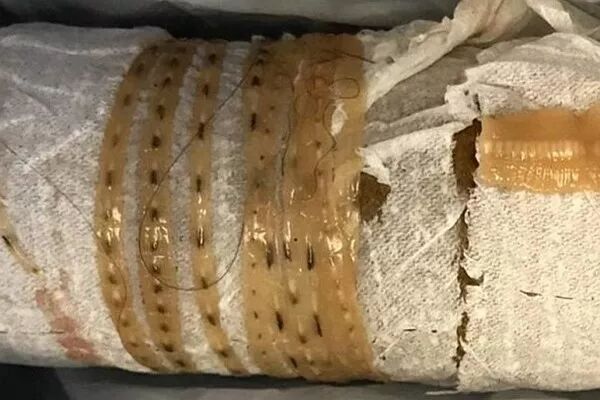 美国政府曾于去年警告,从阿拉斯加海岸捕捉的野生三文鱼或有绦虫感染。而加州男子弗雷斯诺却不以为然,三文鱼刺身日不离口。一日,他上厕所时忽感异样,竟排出了一条长长的活绦虫(Tapeworm)。当地急诊医生巴恩描述说,该病人自称腹泻带血,特来“医虫”。巴恩半信半疑,因病人自我诊断通常未必准确,而病人信誓旦旦,并掏出一物自证:一个口袋里装有一个厕纸筒,上面还卷着一条虫。巴恩将虫展开,测得1米6,与他一般高。病人则兴奋地表示,当他看到他拉出来的是一条正在蠕动的虫子时,他颇感欣慰……因为,他原以为自己拉出的,是自己的肠子……
