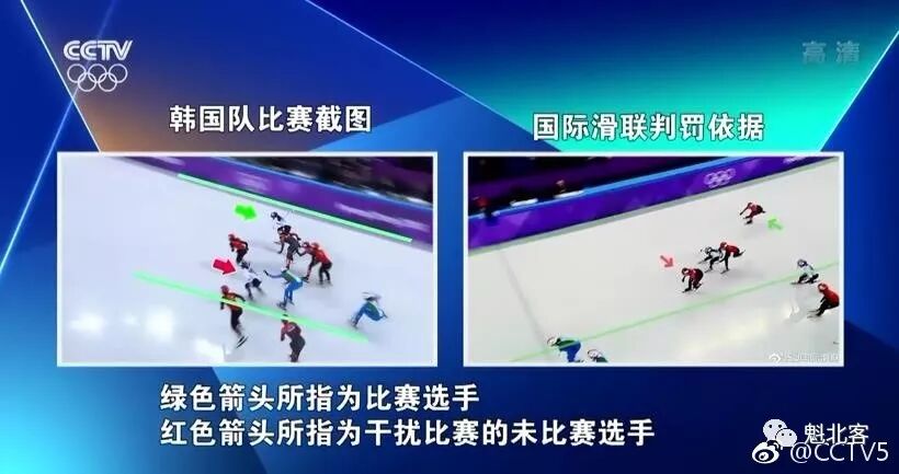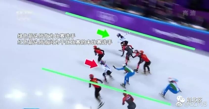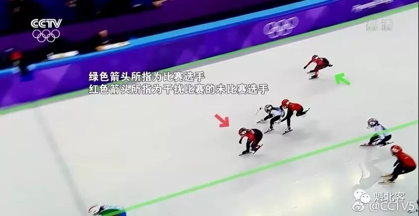 绿色箭头指向的是韩国队正在比赛的运动员,红色箭头指的是干扰比赛的未比赛选手,如图,红色箭头所指韩国选手明明干扰了身后刚刚完成接力的意大利运动员。