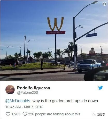 一美国网友昨日发帖:美国加州Lynwood一家麦当劳的招牌怎么被倒了过来?M变W,这是谁的恶作剧?麦当劳首席多元化官员表示,“女性无所不在”,这是麦当劳史上首次颠倒标志,以纪念世界各地女性的特殊成就。麦当劳表示,3月8日当天,他们将把包括Twitter、Instagram在内的所有线上账号的头像全部换成W。还将有100家麦当劳门店于当天提供印有这一特殊标志的衬衫、帽子、提包等纪念品。全球女性网友对此事褒贬不一:“用此方式庆祝妇女节,麦当劳才是真戏精”;“364天都是Men,只有一天变Women,怎么改都是歧视”;“我以为金拱门让沃尔玛(Walmart)给收了呢……”