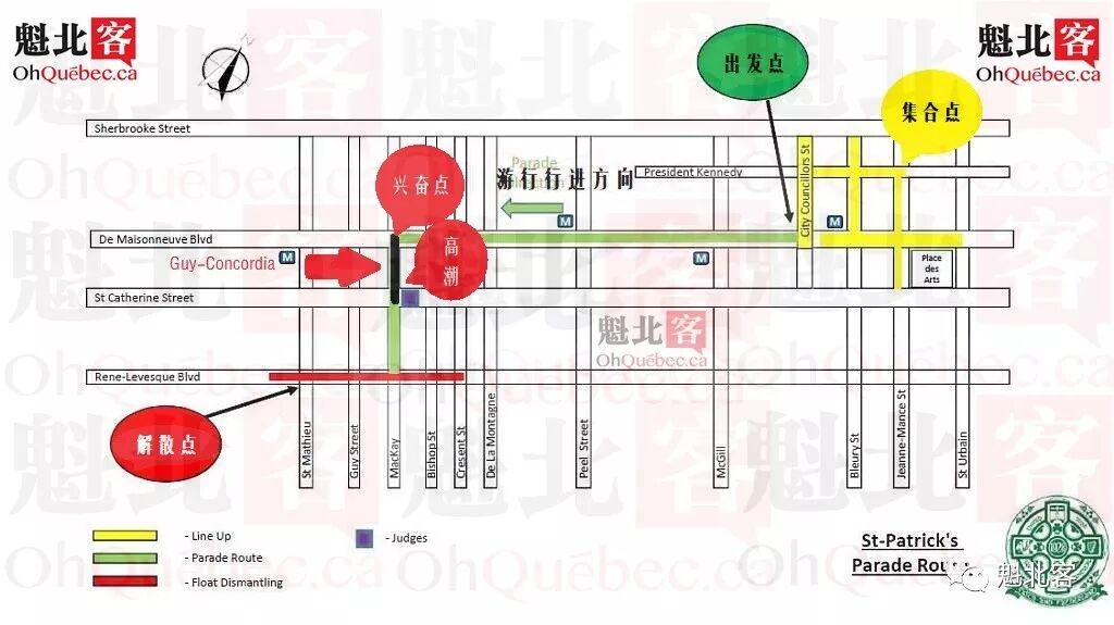 绿色:今年的游行路线:从City councillors街与De Maisonneuve街路口出发,沿De Maisonneuve街西行至Mackey街左转,至Rene-Levesque街结束;