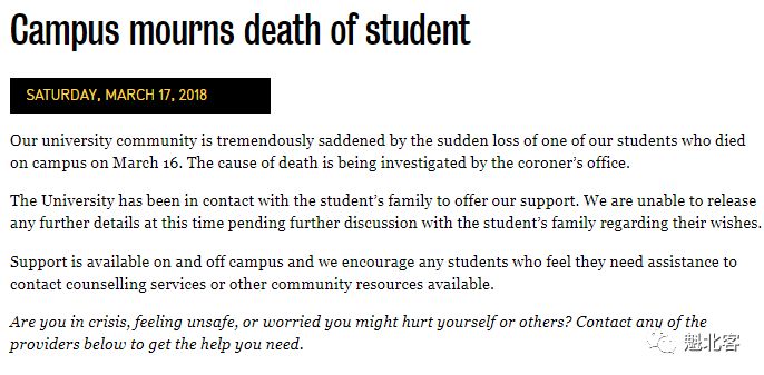 3月17日,滑铁卢大学发布官方消息称,3月16日,有一名学生被发现在宿舍内身亡,具体死因仍在验尸确认中。