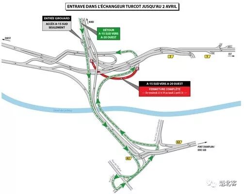 蒙特利尔Turcot立交桥的一个重要匝道将于今日起关闭一整周。该匝道的关闭将导致15南高速不能直通20西。司机必须通过De La Verendrye街绕行,即从15号南高速南行至62号出口驶出,沿De La Verendrye街向西,在Galt街调头,再次回到De La Verendrye街,然后向东,进入Turcot立交桥特设入口,沿新匝道行驶右盘左拐并入20西。此绕行路线将开放至下周一(4月2日)早上5点。