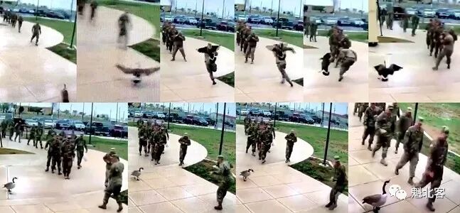 周三网上惊现视频,验证了题目观点。视频显示,一队加拿大军人正于军营中行走,队首一人被一正于过道闲逛的加拿大鹅盯上。将此人视作威胁的加拿大鹅突然对其发起攻击。军人先是下意识侧身飞踹,然而后腿不稳明显想逃,急转而踉跄,趔趄险摔倒。再尴尬的军人也是军人,他试图反击找回颜面。其双拳紧握,脚下碎步呈散打节奏……大鹅应该不会格斗,施展“狮子吼”气贯长虹脚步坚定步步为营……此士兵一定脑补了魁北客周二刊出的新闻九卦第九卦,怔了怔,转身便逃……其他军人则于旁安静走过,任凭鹅言讥讽,敢怒不敢言。大鹅引吭高歌,霸道自豪……