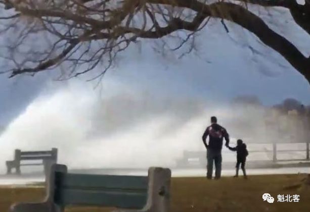 Lachine市,大浪拍打着堤岸。浪花被狂风卷起数米,淹没了附近的自行车道。旁边有草就好了,或者赶紧回家搬花儿,可别浪费了这黄金加强版的花园洒水器……