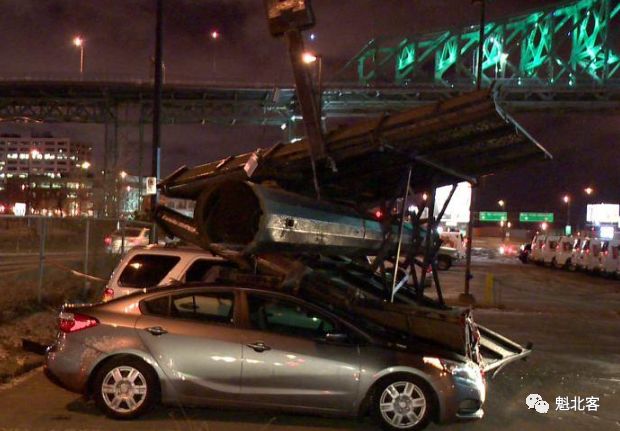 Notre-Dame街和Ville-Marie街之间的一个停车场内,广告牌被狂风放倒,砸到了三辆车。看着这张照片,小编都觉得自己能听到车辆被砸后发出的沉闷巨响。
