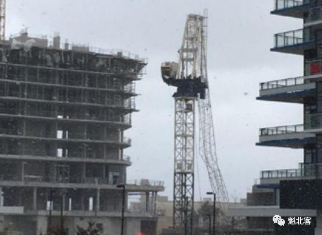 多伦多,风速高达每小时100公里!密西沙加一个商场的屋顶被狂风撕裂!就连建筑工地里塔吊的“铁臂”都被吹塌了!不,是被吹弯了!吹弯了……